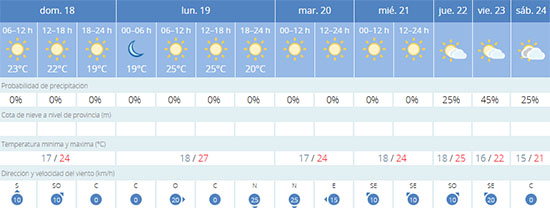 NERJA – De meteorologen van het weerstation Aemet (Agencia Estatal de Meteorología) verwachten gedurende de eerste dagen van de komende week veel zon en gemiddelde dagtemperaturen tot 27 graden Celsius rond Nerja.