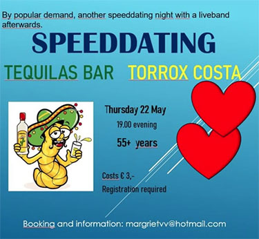 TORROX-COSTA – Bij Tequilas Bar aan de Calle Estepona in de kustplaats Torrox-Costa (op amper tien kilometer van Nerja gelegen, red.) staat donderdagavond 22 mei (aanvang 19.00 uur) een speeddating-avond op het programma.