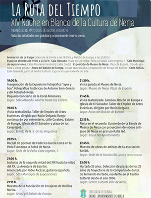 Centrale punten met veel optredens zijn daarbij het historisch Museum van Nerja (tussen 10.00 en 21.30 uur) het Plaza de la Ermita, Balcón de Europa (tussen 18.00 en 20.00 uur) en het Centro Cultural Villa de Nerja aan de Calle Granada 45 (tussen 21.30 en 23.00 uur). Daarnaast is er op de straten in de binnenstad van alles te doen.