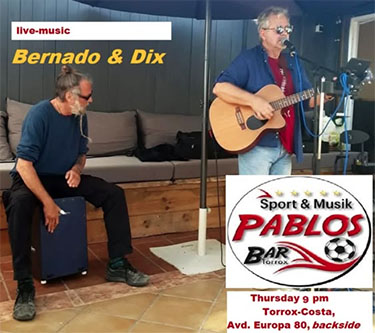 Duo Bernado & Dix bij Pablos Sport and Music Bar in Torrox TORROX – Het duo Bernado & Dix treedt donderdagavond 29 mei op bij Pablos Sport and Music Bar in de kustplaats Torrox. De bar is te vinden aan de Avenida Europa 80, het optreden begint rond de klok van 21.00 uur. Delen: Klik om te delen op X (Opent in een nieuw venster) X Klik om te delen op Facebook (Opent in een nieuw venster) Facebook Vind-ik-leuk Aan het laden...