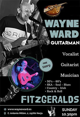 NERJA – De Britse gitarist en zanger Wayne Ward (aka ´The Guitar Man´) treedt zondagavond 1 juni op bij Fitzgerald’s Bar II, in het centrum van de stad aan de Calle Antonio Millón 2.