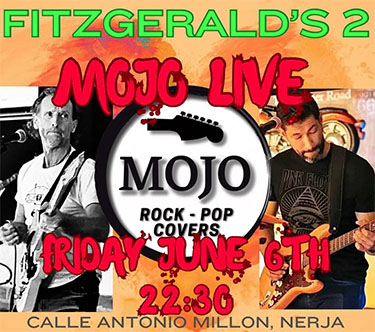 NERJA – De coverband Mojo speelt vrijdagavond 6 juni bij Fitzgerald’s Bar II aan de Calle Antonio Millón 2 in het centrum van Nerja.