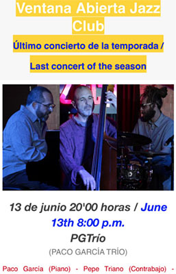 Entreebewijzen (15 euro per stuk) dienen vooraf te worden gereserveerd. Dit kan telefonisch via het nummer (+34) 690 073 871 óf via internet op http://www.ventana-abierta.es/jazz . Het Paco García Trio bestaat uit pianist Paco García, Pepe Triano op contrabas en drummer Giustino Graziosi.