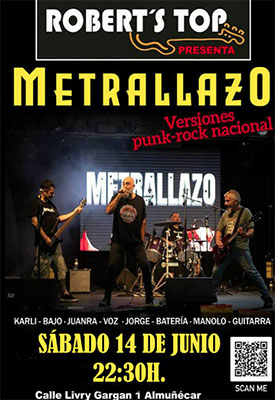 ALMUNECAR – Bij bar/restaurant Robert’s Top in Almuñécar treedt zaterdagavond 14 juni de band Metrallazo op. Het optreden begint rond 22.30 uur.