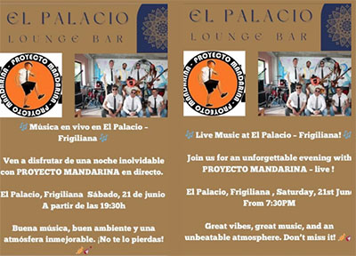FRIGILIANA – In het bergdorp Frigiliana, op circa zeven kilometer landinwaarts van Nerja, treedt zaterdagavond 21 juni de uit Nerja afkomstige band Proyecto Mandarina op. Dit gebeurt bij loungebar El Palacio aan het Plaza de Las Tres Culturas 28 in Frigiliana.
