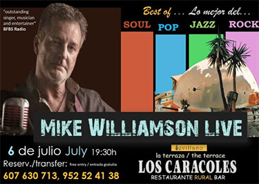 TORROX – Bij restaurante Los Caracoles del Sevillano aan de M-105 tussen Torrox en Frigiliana staat zondagavond 6 juli een optreden geprogrammeerd van de zanger en gitarist Mike Williamson. De avond begint rond de klok van 19.30 uur.