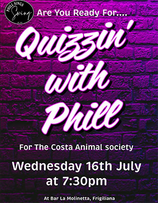 Dit gebeurt tijdens een (Engelstalige) quizavond ten faveure van de dierenorganisatie CAS (Costa Animal Society). Het optreden begint rond de klok van 19.30 uur. De entreeprijs bedraagt drie euro per persoon.