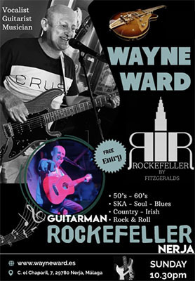 NERJA – De Britse gitarist en zanger Wayne Ward (aka ´The Guitar Man´) treedt zondagavond 20 juli op bij Rockefeller by Fitzgerald’s, in het centrum van de stad aan de Calle El Chaparil 7.