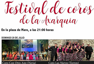 MARO – In het kustdorp Maro, behorend tot de gemeente Nerja en vrijwel aanpalend aan de stad Nerja gelegen aan de kust, is zondagavond 20 juli het Festival de Coros de la Axarquía te beluisteren. Een en ander vindt plaats vanaf 21.00 uur op het Plaza de Maro in het dorp.