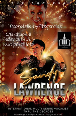 Sandy Lawrence treedt op bij Rockefeller in Nerja NERJA – De zangeres Sandy Lawrence treedt vrijdagavond 25 juli op Rockefeller by Fitzgerald´s, in het centrum van Nerja aan de Calle El Chaparil 7. Het optreden begint rond de klok van 22.30 uur en duurt tot ruim na middernacht. Delen: Klik om te delen op X (Opent in een nieuw venster) X Klik om te delen op Facebook (Opent in een nieuw venster) Facebook Vind-ik-leuk Aan het laden...