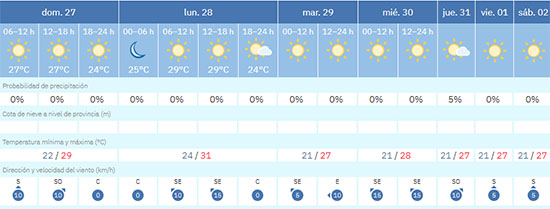 Dit blijkt uit de meest recente weersvoorspellingen van de meteorologen van het weerstation Aemet (Agencia Estatal de Meteorología). De wind is de komende week zwak tot matig en neerslag wordt opnieuw niet verwacht.
