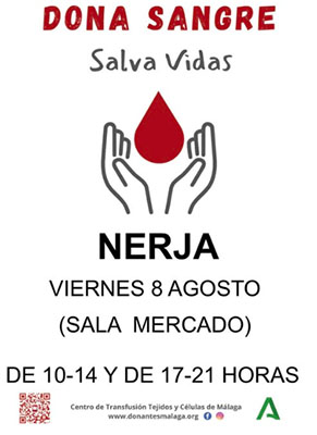 Mensen die bloed willen doneren kunnen tussen 10.00 en 14.00 uur én tussen 17.00 en 21.00 uur terecht in de Sala Mercado aan het Plaza de la Ermita van Nerja. Het vooraf maken van een afspraak wordt aanbevolen, dit kan via de telefoonnummers +34 951 034 120 en +34 951 034 121 (tussen 11.00 en 14.00 uur) óf via de website http://www.donantesmalaga.org .