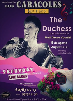 TORROX – Bij restaurante Los Caracoles del Sevillano aan de M-105 tussen Torrox en Frigiliana staat zaterdagavond 9 augustus een optreden geprogrammeerd van de zangeres Sandy Lawrence. De avond begint rond de klok van 20.15 uur.
