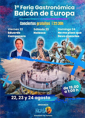 Op vrijdagavond 22 augustus is er een optreden van Eduardo Campanero, op zaterdag 23 augustus gevolgd door Nolasco en op zondag 24 augustus wordt de eerste editie van het Feria Gastronómica in Nerja afgesloten door de formatie No me pises que llevo chanclas.