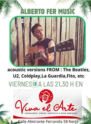 NERJA – Bij de vorige maand geopende bar Viva el Arte in Nerja treedt zaterdagavond 15 augustus de regionaal vermaarde gitarist Alberto Fer op. Cerveceria Viva el Arte is te vinden aan de Calle Almirante Ferrandis (in de volksmond Calle Cristo genoemd) 58 in het centrum van Nerja.