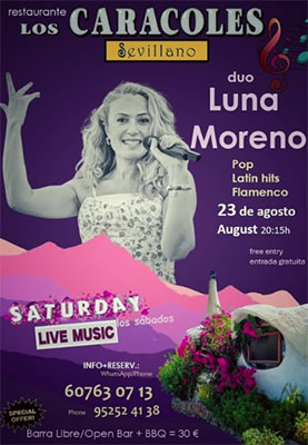 TORROX – Bij restaurante Los Caracoles del Sevillano aan de M-105 tussen Torrox en Frigiliana staat zaterdagavond 23 augustus een optreden geprogrammeerd van het Dúo Luna Moreno. De avond begint rond de klok van 20.15 uur.
