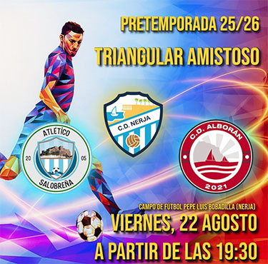 NERJA – In het voetbalstadion Pepe Luis Bobadilla aan de Calle Carlos Millón in Nerja spelen drie voetbalclubs vrijdagavond 22 augustus in een zogeheten Triangular Amistoso. De drie deelnemende clubs zijn CD Nerja, Atlético Salobreña en CD Alborán.