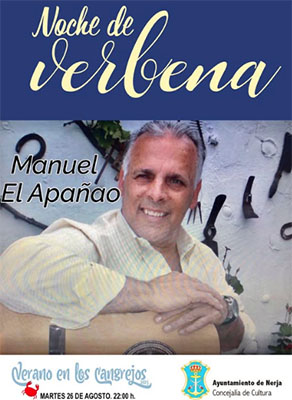 NERJA – In het kader van het culturele activiteitenprogramma ´Verano en Los Cangrejos´van de gemeente Nerja is er dinsdagavond 26 augustus een animatieprogramma voorzien op het Plaza de los Cangrejos, onder de naam ‘Noche de Verbana´. Dit begint rond de klok van 22.00 uur. Deze ´Noche de Verbena´ wordt verzorgd door de artiest Manuel el Apañao.