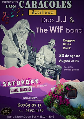 TORROX – Bij restaurante Los Caracoles del Sevillano aan de M-105 tussen Torrox en Frigiliana staat zaterdagavond 30 augustus een optreden geprogrammeerd van het Duo JJ and the WTF-Band.