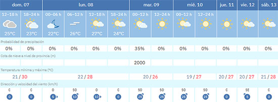 NERJA – De komende week blijft het warm met veel zon en gemiddelde dagtemperaturen iets onder de 30 graden Celsius voor Nerja en omgeving. Op dinsdag 9 en woensdag 10 september waait er een matige wind, van regen is geen sprake in de huidige vooruitzichten van de Spaanse meteorologische dienst Aemet (Agencia Estatal de Meteorología).