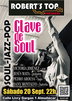 ALMUNECAR – Bij bar/restaurant Robert’s Top in Almuñécar staat zaterdagavond 20 september een optreden geprogrammeerd van de band Clave De Soul. Het optreden begint rond 22.00 uur.