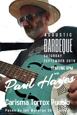 TORROX-PUEBLO – In de kustplaats Torrox, op circa tien kilometer van Nerja gelegen, treedt zaterdagavond 20 september de zanger/gitarist Paul Hayes op. Dit gebeurt bij bar Carisma aan de Paseo de las Moreras 50 in Torrox-Pueblo.