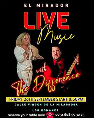 LOS ROMANES – In het Axarquía-dorp Los Romanes, behorend tot de gemeente La Viñuela en te vinden naast het meer van Viñuela, treedt vrijdagavond 26 september het Duo The Difference op. Dit gebeurt bij restaurant El Mirador aan de Calle Virgen de la Milagrosa.