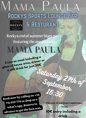NERJA – Bij Rocky’s Bar in Nerja treedt zaterdagmiddag 27 september de blueszangeres en -gitariste Mama Paula op. Het optreden begint rond de klok van 16.30 uur.