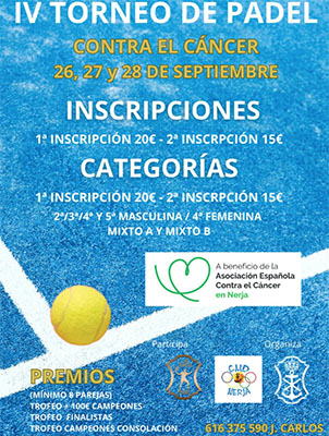 NERJA – Op de banen van het stadion Enrique Lopez Cuenca (naast de atletiekbaan) langs de N-340 in Nerja wordt van vrijdag 26 tot en met zondag 28 september gestreden in het vierde Torneo de Pádel Contra el cáncer. De opbrengsten komen ten goede aan de Asociación Española Contra el cáncer.