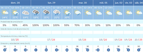 Maandag 29 september dreigt volgens de meteorologen volledig in het water te vallen, daarna is naar verwachting de gehele week droog. Wél wordt daarbij de zon aan het oog onttrokken door veel passerende wolkendekken. De temperaturen rond Nerja blijven ook de gehele komende week schommelen rond de 25 graden Celsius.