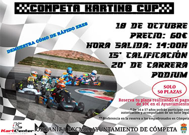 CÓMPETA – In het Kartcenter Compillos van het Axarquía-dorp Cómpeta wordt op zaterdag 18 oktober gestreden om de Cómpeta Karting Cup. Er zijn vijftig startplaatsen, inschrijven kan tot en met vrijdag 3 oktober bij het gemeentehuis van Cómpeta (kosten zestig euro).