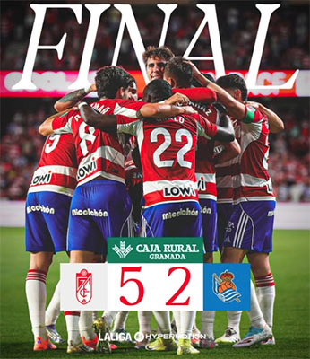 GRANADA – Voetbalclub Granada CF heeft zaterdagavond 4 oktober de laatste plaats in de Spaanse Segunda División overgedaan aan Real Sociedad B. In een rechtstreeks en doelpuntrijk duel in het stadion Nuevo Los Carmenes van Granada tussen beide laagvliegers incasseerde de thuisclub de drie punten door de wedstrijd met 5-2 naar zich toe te trekken.