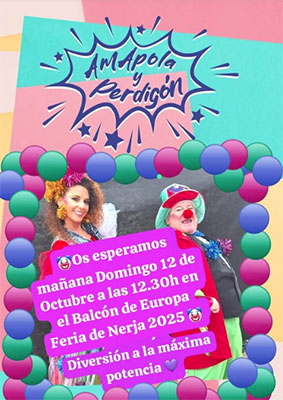 Kindershow AmApola y PerdiGón op Balcón de Europa NERJA – In het kader van het Feria de Nerja is er zondagmiddag 12 oktober een animatieprogramma voor kinderen voorzien op het Balcón de Europa, met het duo AmApola y PerdiGón in de hoofdrol. De kindershow begint rond de klok van 12.30 uur. Delen: Klik om te delen op X (Opent in een nieuw venster) X Klik om te delen op Facebook (Opent in een nieuw venster) Facebook Vind-ik-leuk Aan het laden...