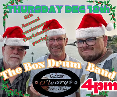 NERJA – Gewoontegetrouw heeft de Ierse pub O´Learys in Torrox ook dit jaar een zogeheten ´Annual Christmas Party´, een week vóór de officiële viering van Kerstmis. Op donderdag 18 december (aanvang 16.00 uur) staat de bar volledig in het teken van het jaarlijkse feest, waarbij Lee Townsend en zijn Box Drum Band voor de muzikale klanken zorgen.