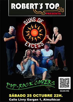 ALMUNECAR – Bij bar/restaurant Robert’s Top in Almuñécar staat zaterdagavond 25 oktober een optreden geprogrammeerd van de band Suns of Excess. Het optreden begint rond 22.00 uur.