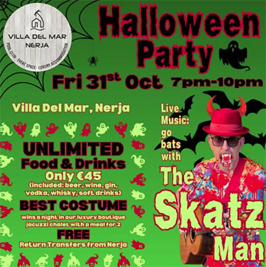 MARO – Camping Villa del Mar in Maro (aan de kust naast Nerja gelegen) viert dit jaar het jaarlijkse Halloween-feest op vrijdag 31 oktober met een optreden van de zanger ´The SkatzMan´. De show begint rond de klok van 19.00 uur en duurt tot circa 22.00 uur.