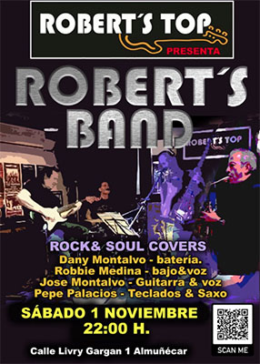 ALMUÑÉCAR – In bar/restaurant Robert’s Top in Almuñécar staat zaterdagavond 1 november een optreden geprogrammeerd van Robert´s Band. Het optreden begint rond 22.00 uur.