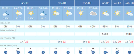 Dit voorziet de Spaanse meteorologische dienst Aemet (Agencia Estatal de Meteorología) in de jongste weersvoorspellingen. De wind laat het de komende dagen ook afweten, waarbij donderdag 6 november een uitzondering is als de wind bij vlagen aanzwelt tot matig of zelfs sterk. De kans op regen is vrij klein, al spreken de meteorologen in de nacht van woensdag 5 op donderdag 6 november in de huidige vooruitzichten op een neerslagkans van 45 procent.