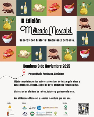 ALMÁCHAR – In het Axarquía-dorp Almáchar is zondag 9 november de jaarlijkse Mercado Moscatel te bezoeken. Deze negende editie van de Mercado Moscatel vindt plaats in het lokale Parque María Zambrano, waar deze dag een eerbetoon wordt gebracht aan de smaken, aroma’s, muziek en tradities uit de Axarquía-regio.