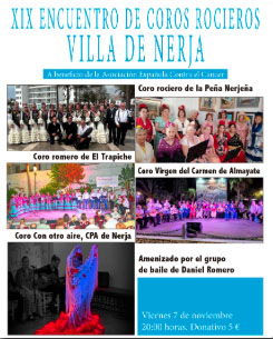 Dit betreft een benefietconcert van circa twee uur waarvan de opbrengsten ten goede komen aan de Asociación Española Contra el Cáncer. Opgetreden wordt er vanaf 20.00 uur. Deelnemende koren zijn onder meer Alumnas de Escuela Municipal de Danza de Nerja, Coro Narixa, Grupo Gotelà en de Academia de Castañuelos y Baille de Jennifer González. De entreeprijs bedraagt vijf euro per persoon, tickets zijn verkrijgbaar aan de kassa´s van het Centro Cultural aan de Calle Granada 45 of te reserveren via de internetlink https://www.giglon.com/todos?idEvent=encuentro-de-coros-rocieros-villa-de-nerja