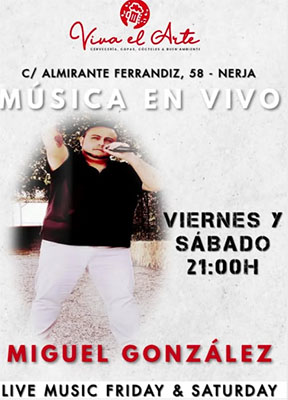 NERJA – Bij bar Viva el Arte in Nerja treedt vrijdagavond 7 en zaterdagavond 8 november de Spaanse artiest Miguel González op. Cerveceria Viva el Arte is te vinden aan de Calle Almirante Ferrandis (in de volksmond Calle Cristo genoemd) 58 in het centrum van Nerja.