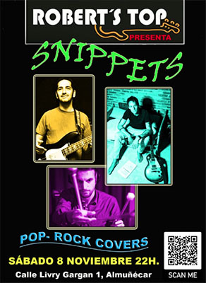 ALMUÑÉCAR – Bij bar/restaurant Robert’s Top, in de kustplaats Almuñécar, staat zaterdagavond 8 november een optreden geprogrammeerd van de band Snippets. Het optreden begint rond 22.00 uur en duurt ongeveer twee uur.