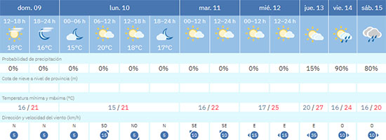 NERJA – Nerja en naaste omgeving staat een week te wachten met fraai nazomerweer, waarbij de gemiddelde dagtemperaturen midden in de week oplopen naar maar liefst 27 graden Celsius. Wél is er veelal sprake van bewolking, waaruit aan het einde van de week en in het volgende weekeinde ook neerslag wordt verwacht. Dit blijkt uit de meest recente vooruitzichten van het weerstation Aemet (Agencia Estatal de Meteorología).