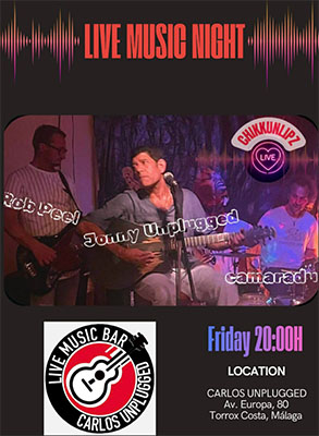 TORROX – Bij de live-music bar Carlos Unplugged in de kustplaats Torrox treedt vrijdagavond 14 november de formatie Chikkunlipz op. De formatie bestaat uit Rob Peel, Jonny Unplugged en Camaradu.