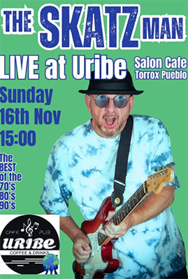 TORROX – Bij Uribe Salon Cafe in de kustplaats Torrox (een kleine tien kilometer onder Nerja gelegen) treedt zondagmiddag 16 november de zangeren gitarist Skatz (aka ´The SkatzMan´) op.