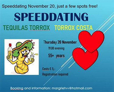 TORROX-COSTA – Bij Tequilas Bar aan de Calle Estepona in de kustplaats Torrox-Costa (op amper tien kilometer van Nerja gelegen, red.) staat donderdagavond 20 november (aanvang 19.00 uur) een speeddating-avond op het programma. De avond staat open voor mannen en vrouwen in de leeftijdscategorie +55 jaar.