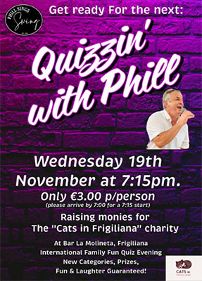 Dit gebeurt tijdens een (Engelstalige) quizavond ten faveure van de dierenorganisatie ´The Cats in Frigiliana´. Het optreden begint rond de klok van 19.15 uur. De entreeprijs bedraagt drie euro per persoon.