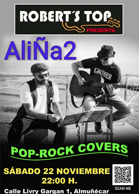 ALMUÑÉCAR – Bij bar/restaurant Robert’s Top in de kustplaats Almuñécar staat zaterdagavond 22 november een optreden geprogrammeerd van het Duo AliÑa 2. Het optreden begint rond 22.00 uur.