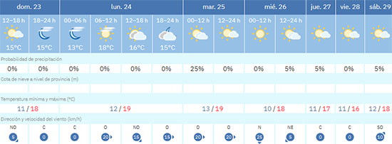 Volgens de huidige vooruitzichten van de Spaanse meteorologische dienst Aemet (Agencia Estatal de Meteorlogía) loopt het kwik de komende dagen niet verder op dan 18 à 19 graden Celsius, mede als gevolg van een vrij sterke en kille wind in het begin van de week. De kans op neerslag lijkt voorlopig zo goed als nihil in de ogen van de weerkundigen.