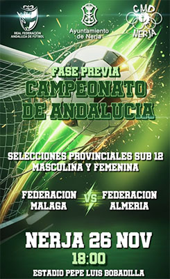 NERJA – Het voetbalstadion Pepe Luis Bobadilla (achter het medisch centrum aan de N-340 in Nerja) vormt op woensdag 26 november het toneel voor voetbalwedstrijden om de Andalusische kampioenschappen voor junioren onder twaalf jaar.